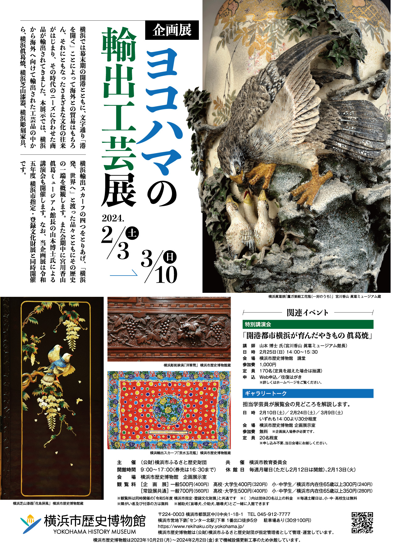 本展示では、横浜から海外へ向けて輸出された工芸品の中から、横浜眞葛焼、横浜芝山漆器、横浜彫刻家具、横浜輸出スカーフの4つをとりあげ、「横浜発、世界へ」と渡った品々とともにその歴史の一端を概観します。