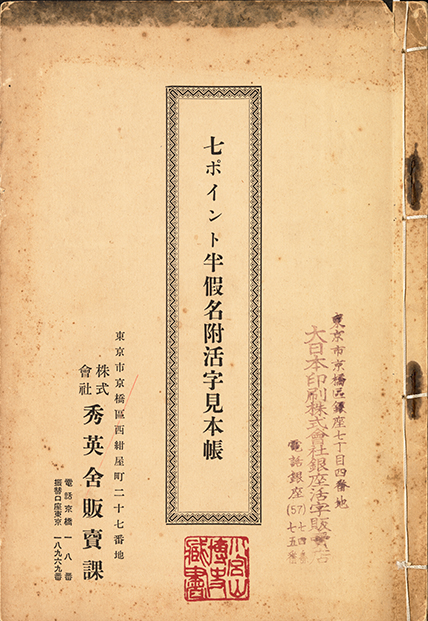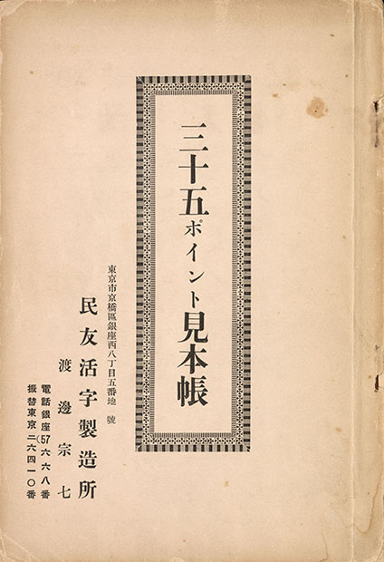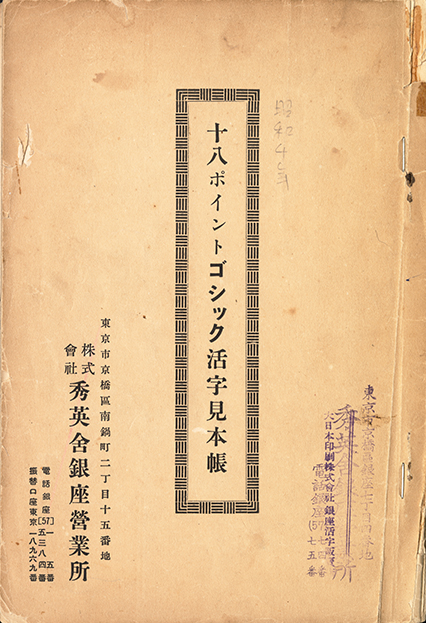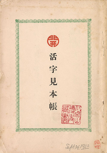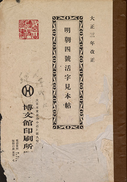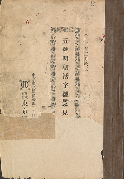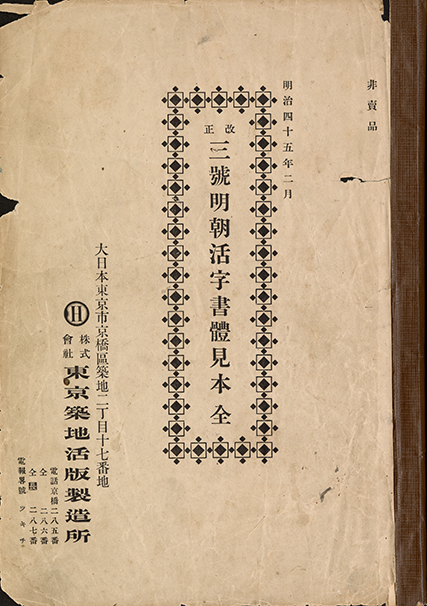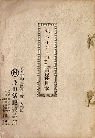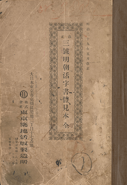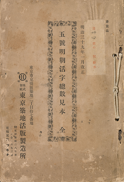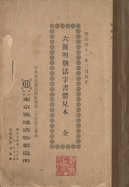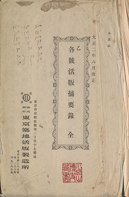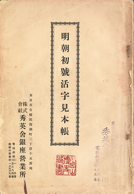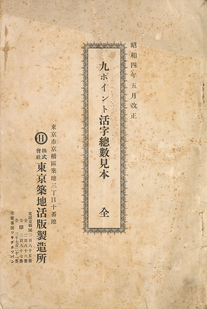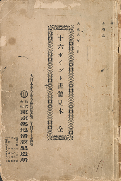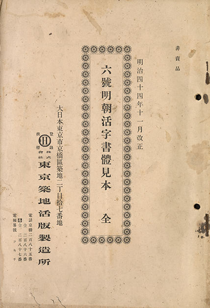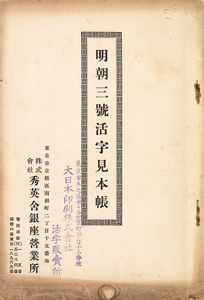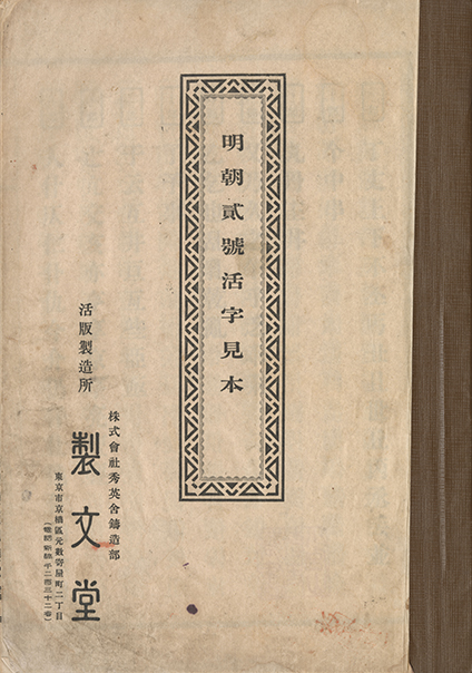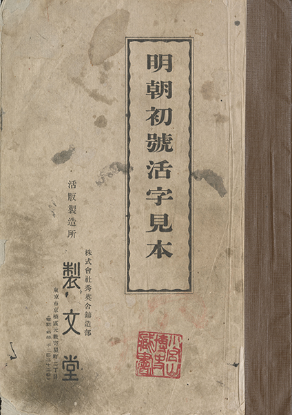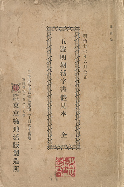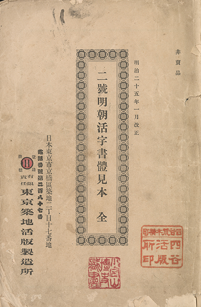 | 東京築地活版製造所 | 『二号明朝活字書体見本 全 明治二十五年一月改正』(1892) 『五号明朝活字書体見本 全 明治廿七年六月改正』(1894) 『五号明朝活字総数見本 全 明治三十九年一月改正』(1906) 『改正三号明朝活字書体見本 全 明治三十九年五月改正』(1907) 『六号明朝活字書体見本 全 明治四十一年三月改正』(1908) 『六号明朝活字書体見本 全 明治四十四年十一月改正』(1911) 『改正三号明朝活字書体見本 全 明治四十五年二月』(1912) 『五号明朝活字総数見[本 全] 大正二年三月改正』(1913) 『乙 各号活版摘要録 全 大正二年六月改正』(1913) 『十六ポイント書体見本 全 大正八年五月』(1920) 『九ポイント活字総数見本 全 昭和四年五月改正』(1931) |