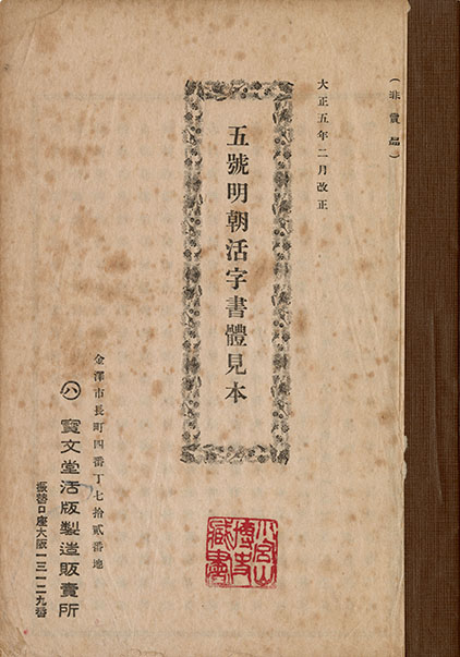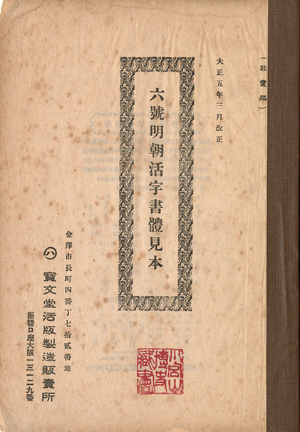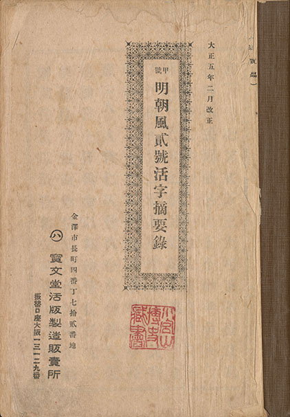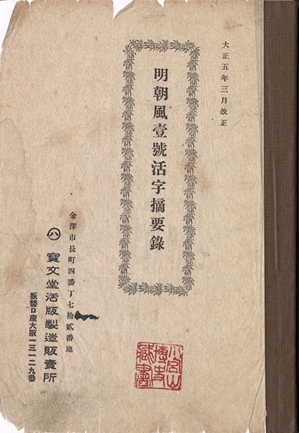| 宝文堂活版製造 | 『五号明朝活字書体見本 大正五年二月改正』(1916) 『甲号 明朝風二号活字摘要録 大正五年二月改正』(1916) 『明朝風一号活字摘要録 大正五年三月改正』(1916) 『六号明朝活字書体見本 大正五年三月改正』(1916) |