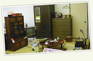 今では、あまり見られなくなったけど、これは、おじいさん、おばあさんが子どものころにあった畳を敷いた部屋(和室)で、茶の間というんだ。食事やだんらんなど家族みんなで過ごしたところだよ。また、寝室(寝るところ)になる場合もあったんだ。狭くてもいろいろ工夫して生活していたんだよ。