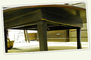このちゃぶ台(だい)は、できるだけ茶(ちゃ)の間(ま)を広(ひろ)く使(つか)えるよう、脚(あし)を折(お)りたたんでかたづけることができるようになっているんだ。部屋(へや)が狭(せま)くても広(ひろ)く使(つか)えるよう工(く)夫(ふう)がしてあるんだね。