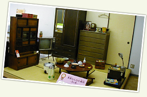 この部屋(へや)は、おじいさん、おばあさんが子(こ)どものころ、多(おお)くのうちににあった「茶(ちゃ)の間(ま)」という部屋(へや)だよ。